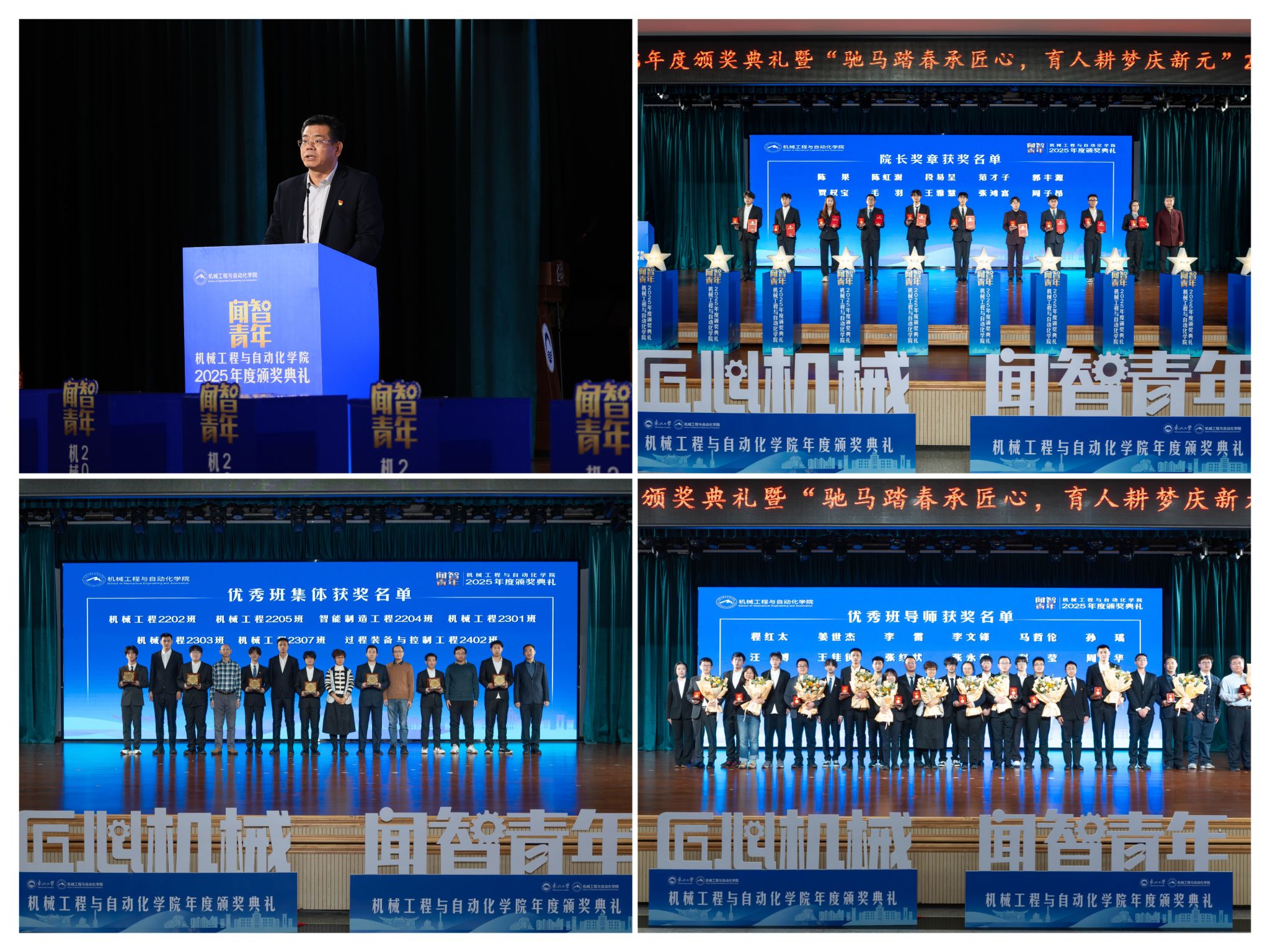 学院党委郝建山正在致辞中系统回首了一年来学院取得的主要成绩。学院积极办事国度计谋,投身深度金属矿智能开采纳配备全国沉点尝试室扶植,并正在环节科研范畴实现标记性冲破,获得国度严沉专项支撑。同时,稳步推进学校新增学位点扶植,为久远成长奠基根本。正在人才培育方面,学院学子表示凸起,研究生学术丰盛,结业生就业率持续连结高位,展示了全面成长的优良素养。郝建山阐释了“闻智青年”品牌的育人内涵,勉励全体师生胸怀“国之大者”,将小我成长融入“制制强国”计谋,过硬本事,怯于立异创制,勤奋成为担任平易近族回复大任的时代新人。副院长罗忠表扬决定。起首颁布的是“院长章”,刘云飞为毛羽等10名正在专业进修、科技立异、社会实践等方面表示杰出的学生颁布章。随后颁布“优良班集体”项,班导师代表为7个正在班风、学风及凝结力扶植中成效显著的班级颁。最初,仪式聚焦育人一线论理学生代表向获评“优良班导师”的教员们献上鲜花取荣誉证书,表达诚挚感谢感动。“院长章”获得者代表毛羽连系科研竞赛取意愿办事履历,讲述了“道阻且长,行则将至”的成长;“优良班集体”获代表豆煜轩分享了班级凝心聚力、共建优秀学风的活泼经验。正在“闻智匠心 共话青蓝”出格环节,优良班导师马哲伦取所带班级学生代表刘定佳同台交换,从分歧视角展示了师生间思惟引领、学业互帮、讲授相长的温情互动,彰显了育人一线的深挚交谊取结实成效。据悉,“闻智青年”是机械工程取从动化学院出力打制的文化育人品牌。本次颁仪式既是年度的集中展现,也是典型树立、激励朝上进步的主要平台,旨正在指导全体学生以先辈为楷模,坚想、夯实专业根本、锻制立异能力,勤奋成长为具有家国情怀、全球视野取创制活力的杰出工程人才,为学校“双一流”扶植和高质量成长注入芳华力量。