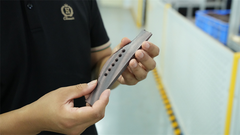 以前每块面板都要用砂纸手工打磨3小时,碰到复杂镶嵌工艺,一天只能完成2把琴。楚门乐器副总司理康卫平回忆,受制于保守工艺,以前企业年产仅1。2万把,订单交付常常要等上20多天。面临日益增加的市场需求,保守出产体例成为楚门吉他成长的瓶颈。2023年,楚门吉他落户东安吉他财产园,智能化变化,两条全从动出产线应运而生。 “引入智能化设备后,从琴颈开槽到音梁雕镂都能通过机械趁热打铁,我们的出产效率大幅提拔。”康卫平轻抚着即将落成的吉他,音梁正在灯光下泛着温润光泽。